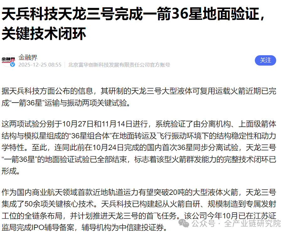 天兵科技天龙三号完成一箭36星地面验证,关键技术闭环