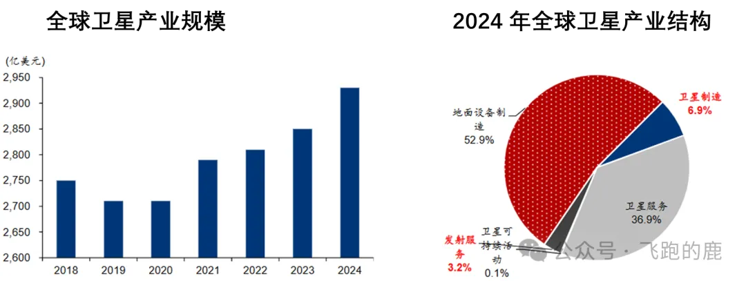 2024 年全球卫星产业总收入达 2930 亿美元,其中卫星制造业收入 201 亿美元、发射服务业收入 93 亿美元,发射成本占卫星公司相关硬性成本的 30%。