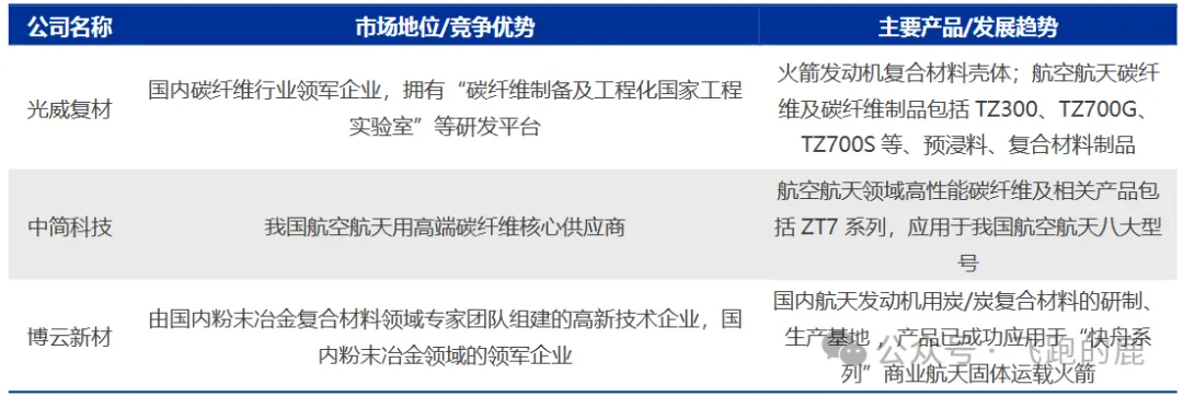 国内航天复合材料的核心生产商包括光威复材、中简科技、博云新材等。光威复材手握碳纤维全产业链布局,是国内碳纤维品种最全、系列化最完整的龙头企业,专注航空航天复合材料研发设计,核心产品直接应用于火箭发动机壳体;中简科技则是我国航空航天高端碳纤维的核心供应商,其量产的 ZT7 系列等高性能碳纤维产品,已成功配套国内航空航天八大型号。