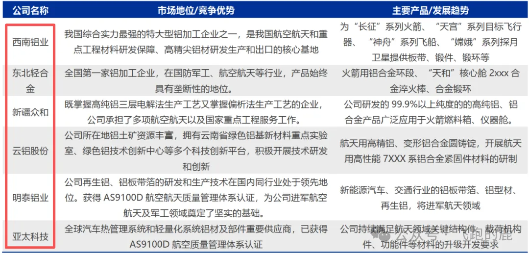铝合金国内核心供应商有西南铝业、东北轻合金等,明泰铝业、亚太科技等新能源汽车铝材领先者也通过相关认证进军航空航天及军工领域。