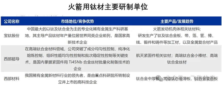 钛合金行业集中度较高,宝钛股份是领域内核心科研生产基地,主营钛合金板、管、锻件等产品,产品直接适配火箭贮箱、发动机壳体等关键航天部件;西部超导手握高端钛合金关键技术,其生产的小棒材、丝材则主要配套航天紧固件的制造需求。