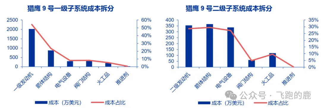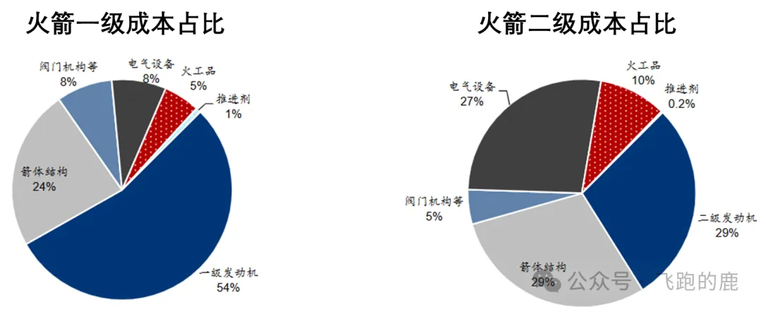 推进系统是火箭成本 “大头”,占总费用的 40%-50%。以 SpaceX 火箭为例:一子级中发动机是成本核心(占 54.3%),其次是箭体结构(23.5%),电气设备、阀门等其他部件占比均较低;二子级里发动机、箭体结构、电气设备成本占比接近(分别 28.6%、29.5%、27.2%),阀门、火工品等占比极小。