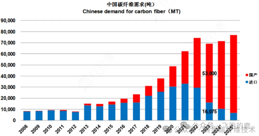 市场规模方面,2023 年中国碳纤维总需求 69,075 吨(同比降 7.2%,增速大幅放缓),进口 16,075 吨(占 23.3%、降 45.4%),国产 53,000 吨(占 76.7%、增 17.8%);进口量断崖式下降主因国产替代增强,次因需求增速不及预期。