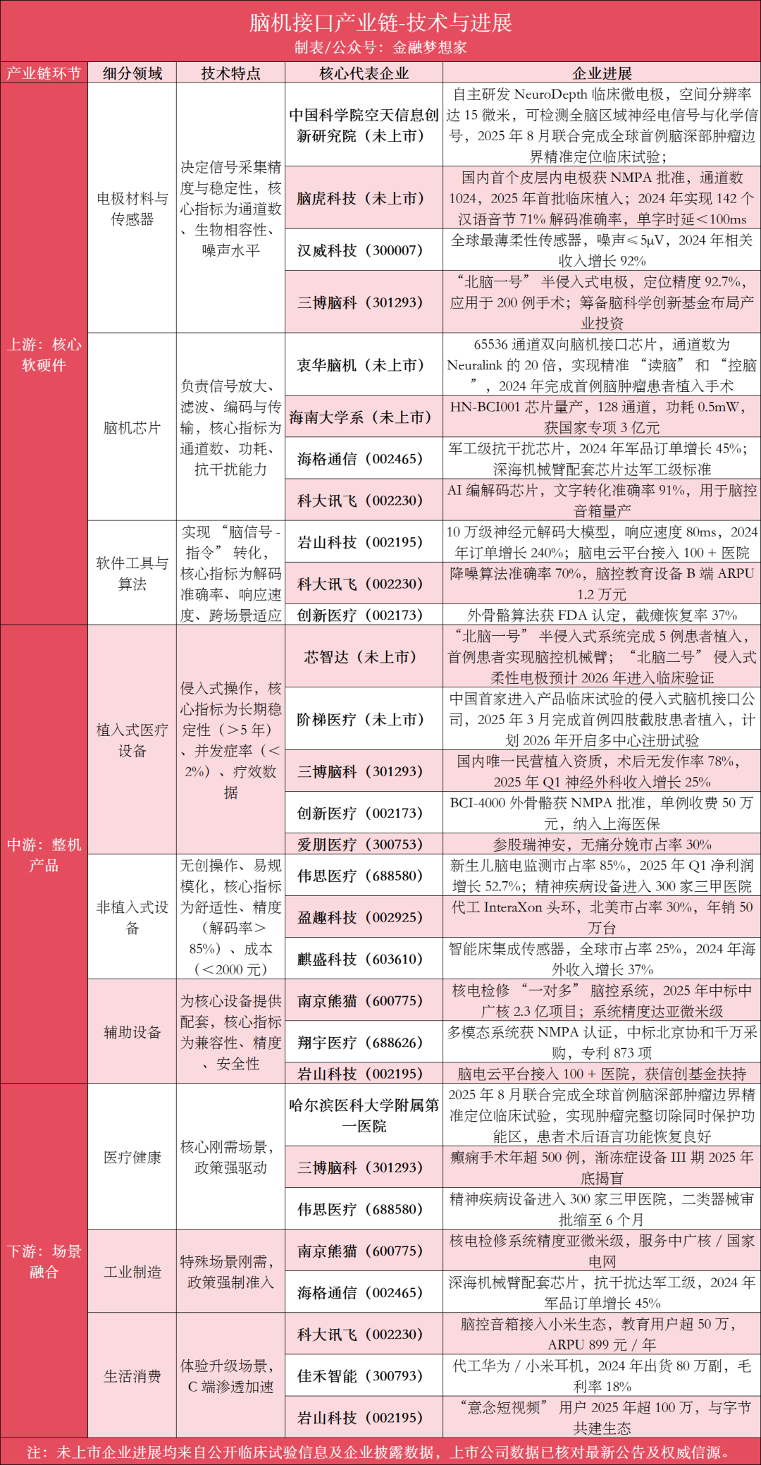 海南大学系(未上市):首款国产脑机专用芯片 HN-BCI001 量产,支持 128 通道采集,功耗 0.5mW(仅为进口产品 1/3),获国家科技重大专项 3 亿元支持。