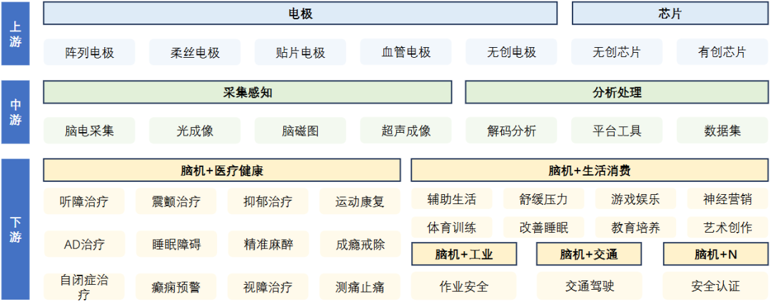 脑机接口行业已经形成了完整的产业链,涵盖上游(材料、芯片、电极等)、中游(信号采集感知处理等)、下游(医疗健康、生活消费、工业生产等)等多个环节。