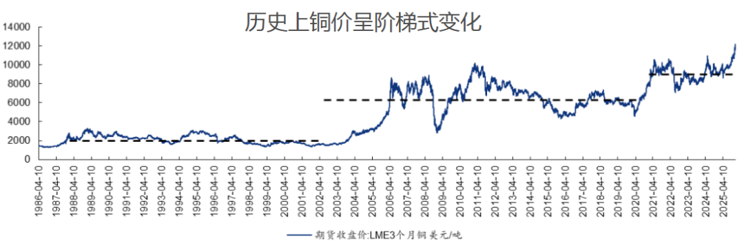 回溯近40 年铜价走势,其长期呈现清晰的台阶式跃迁特征,每一次中枢上移的背后,都是全球经济核心驱动力的迭代切换,是产业趋势与供需格局共同作用的必然结果。