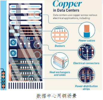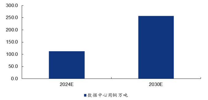 数据中心单位用铜量预计约30t/mw,对应2030年数据中心总用铜量有望翻倍。根据CDA测算,一个传统的数据中心可能需要使用5000到15000吨铜。相比之下,超大规模人工智能数据中心,例如为容纳英伟达HGX系统而建造的数据中心,每个设施可能需要使用多达50000吨铜,未来数据中心建设有望带来一定规模的铜需求。具体而言,根据2009年微软的数据中心建设情况,粗略计算单位mw的数据中心功耗将对应30吨左右的铜消耗。则我们预计2024年的数据中心用铜约为112.8万吨,2030年约为256.8万吨,对应2030年数据中心总用铜量有望较目前翻倍。