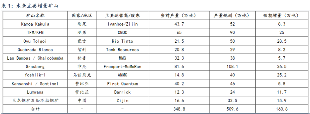 而从目前以及披露的铜矿山扩产规划来看,未来几年主要的铜矿增量可能主要集中在刚果、内蒙、印尼、乌兹别克、赞比亚及中国。相关项目远期合计增量约为160.8万吨,且多数项目将在2028年落地完成,在不考虑产能退出的情况下,2024-2028年的铜矿产量CAGR将约为1.7%,对比近五年数据将有进一步放缓。