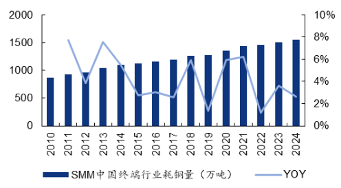 铜被广泛应用于现代工业的各个领域,主要包括电力电子、家用电器、建筑材料、汽车等。2024 年我国终端行业耗铜量1549万吨,同比增速2.7%。下游需求最高的是板块是电力(46.4%),其次是家电、交运、建筑、机械等。