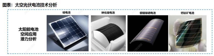 在技术侧,太空光伏的技术路线并非一成不变,而是围绕航天任务对能源系统“高效率、轻量化、低成本、柔性化”的核心诉求快速迭代演进。传统高轨卫星、空间站等高端航天应用长期依赖的砷化镓(GaAs)三结电池,虽具备高可靠性和高转换效率(超32%),但存在成本高昂、难以柔性化制备、供应链依赖特殊原材料等短板,难以适配商业星座规模化部署需求。