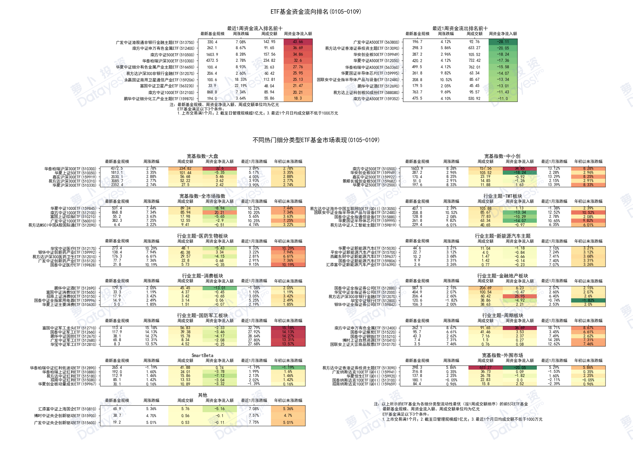 本周(01.05-01.09),广发中证港股通非银行金融主题ETF(513750)大幅净流入43.66亿元,领跑全市场ETF。广发中证A500ETF(563800)大幅净流出28.11亿元。周度成交额最多的基金是华泰柏瑞中证A500ETF(563360)。周度涨幅来看,本周ETF基金全线上涨,分类别看,所有类别均上涨,国防军工类ETF涨幅居前。【跳转链接查看全市场公募基金筛选页面】