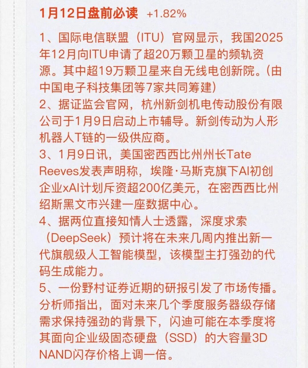 商业航天频轨资源卡位超20万颗,人形机器人核心供应商启动上市辅导,马斯克xAI砸200亿建算力中心,DeepSeek新模型即将发布,存储芯片大厂计划涨价一倍……相关概念龙头代表有哪些?