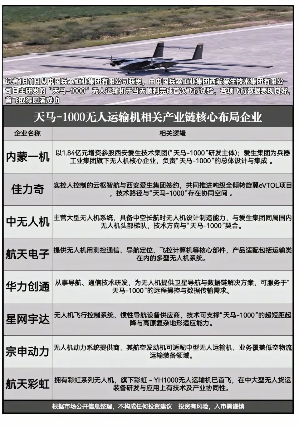 2026年1月11日消息,“天马-1000”无人运输机首飞成功!国产大载荷无人机技术再突破,开启低空物流与特种运输新篇章。相关概念龙头代表:内蒙一机、中无人机、佳奇力等等。