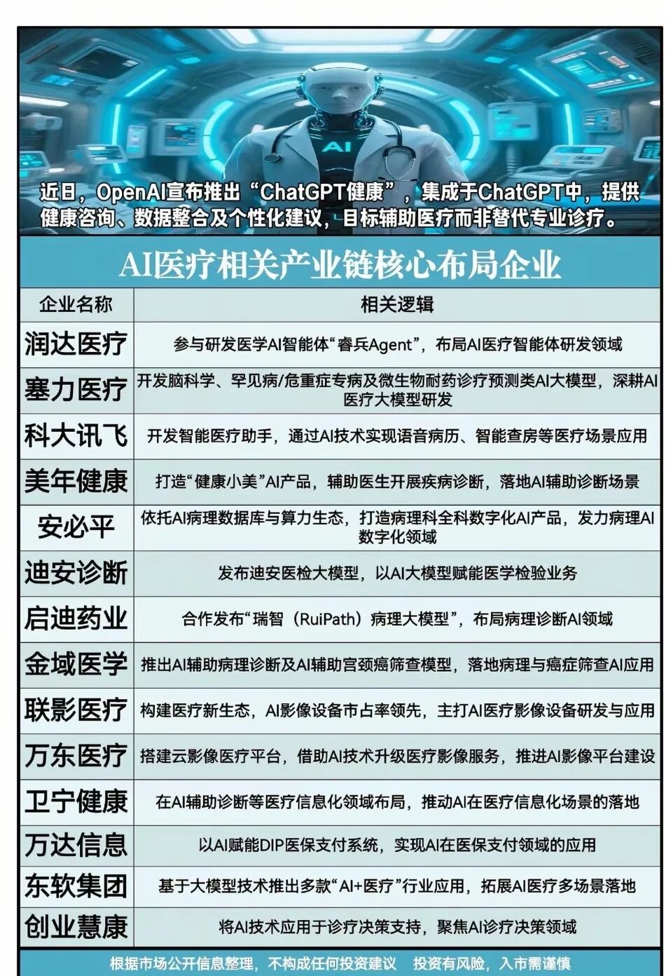 AI医疗/个人医保云概念龙头代表:东软集团、万达信息、卫宁健康、万达信息等等。(理财有风险入市需谨慎,资料仅供参考不能作为投资依据)