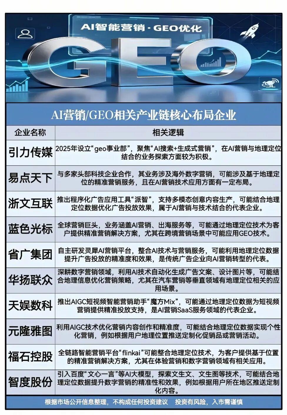2026年Q1多家厂商发布GEO产品,GIS龙头推出AI融合解决方案。相关概念龙头代表:引力传媒、易点天下、浙文互联