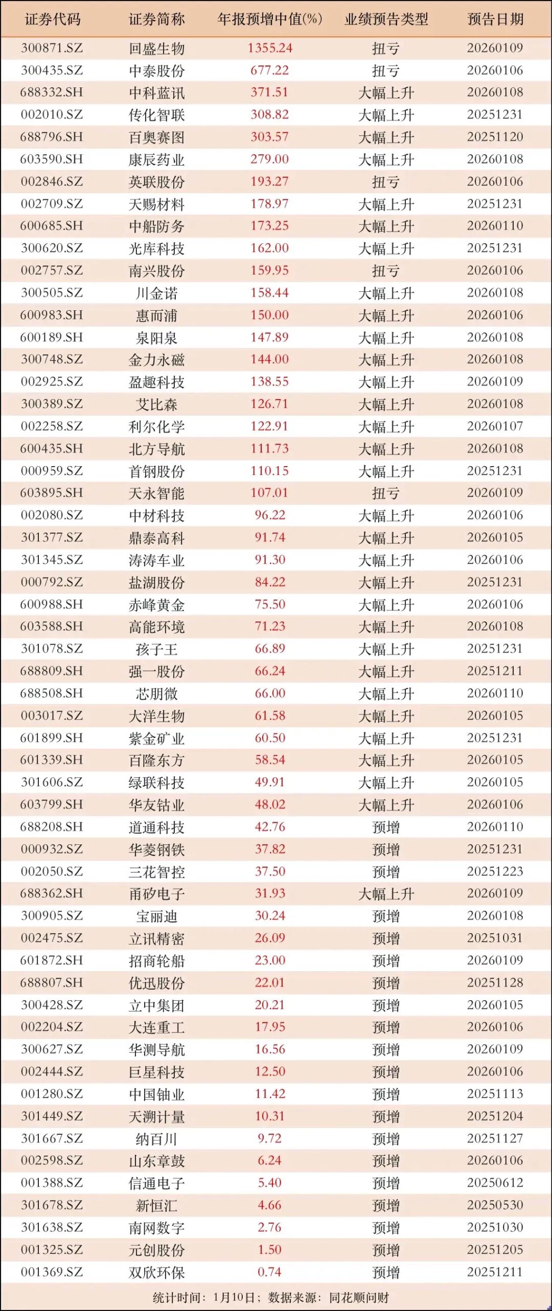 (最新年报预增公司名单出炉,数据截止1月10日!业绩预增预减不代表股价趋势,谨慎参考)