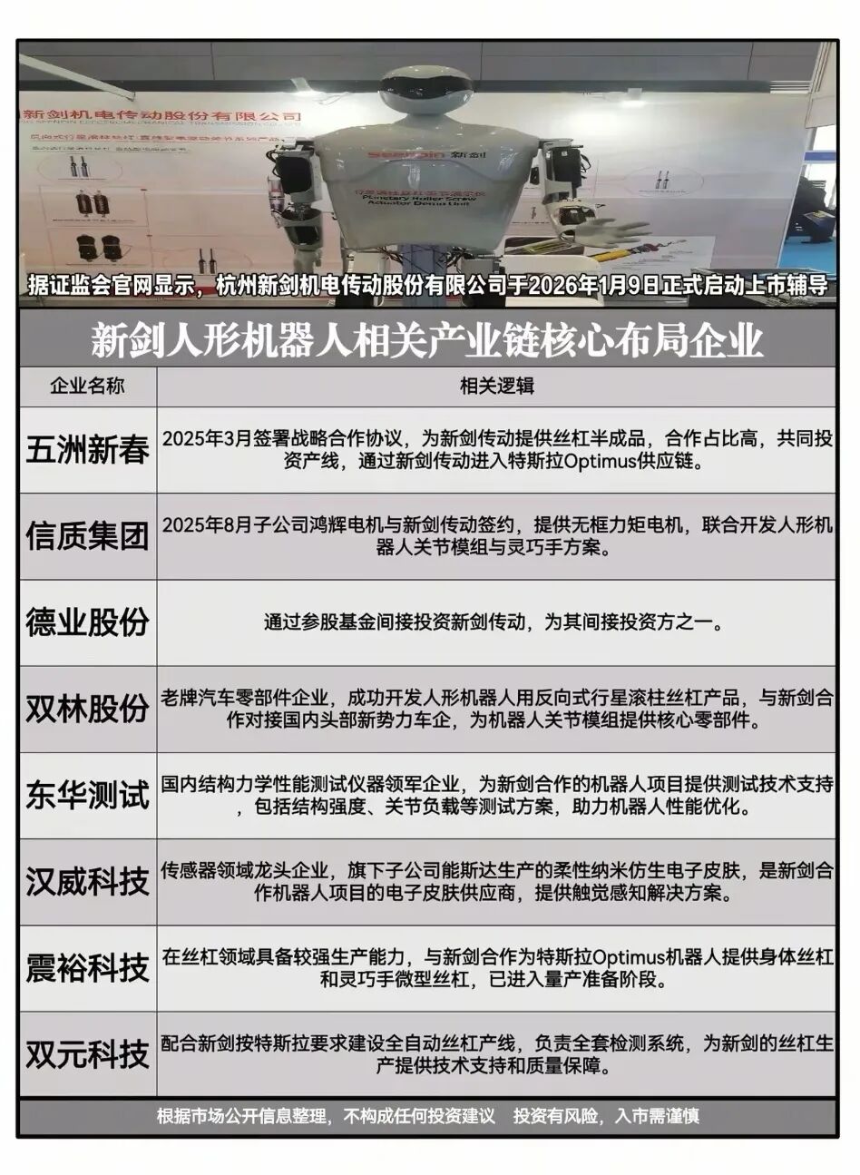 新剑传动1月9日完成上市辅导备案,规划4-5月评估上市条件,公司核心产品为行星滚柱丝杠、灵巧手总成、电驱动关节,应用于特斯拉Optimus等场景。相关概念龙头代表:五洲新春。