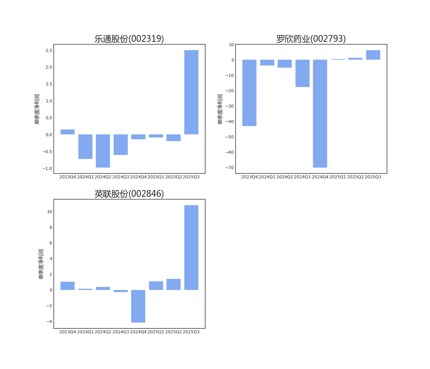 在触发扭亏为盈信号的个股中,以下3只最近一个月涨幅最大,侧面显示出其超预期程度和受资金认可程度较高,可对其进行适当关注。下图展示其最近8个季度的净利润变化,更多财务数据可进入