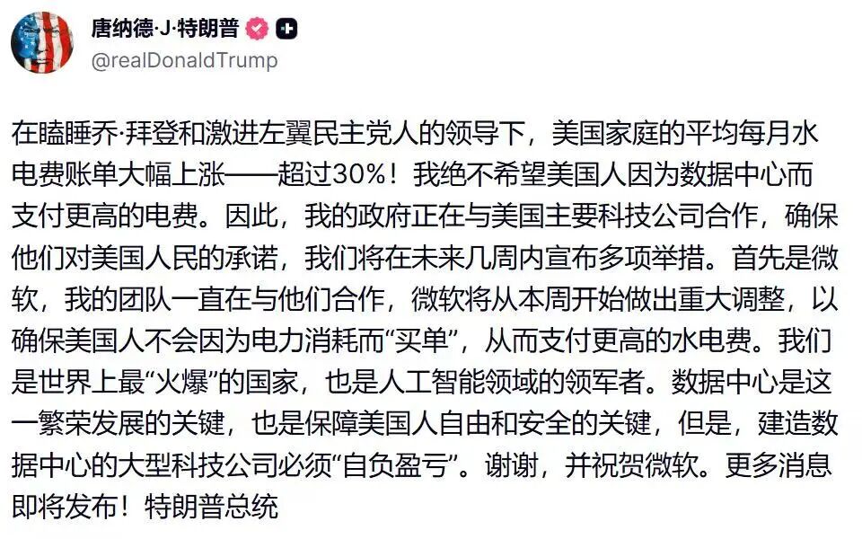 首先是微软,我的团队一直在与他们合作。微软将从本周开始进行重大调整,确保美国人不会以更高的公用事业账单形式,为他们的电力消耗“买单”。我们是世界上‘最火’的国家,也是AI领域的第一名。数据中心是这场繁荣的关键,但建设数据中心的大型科技公司必须自掏腰包。”