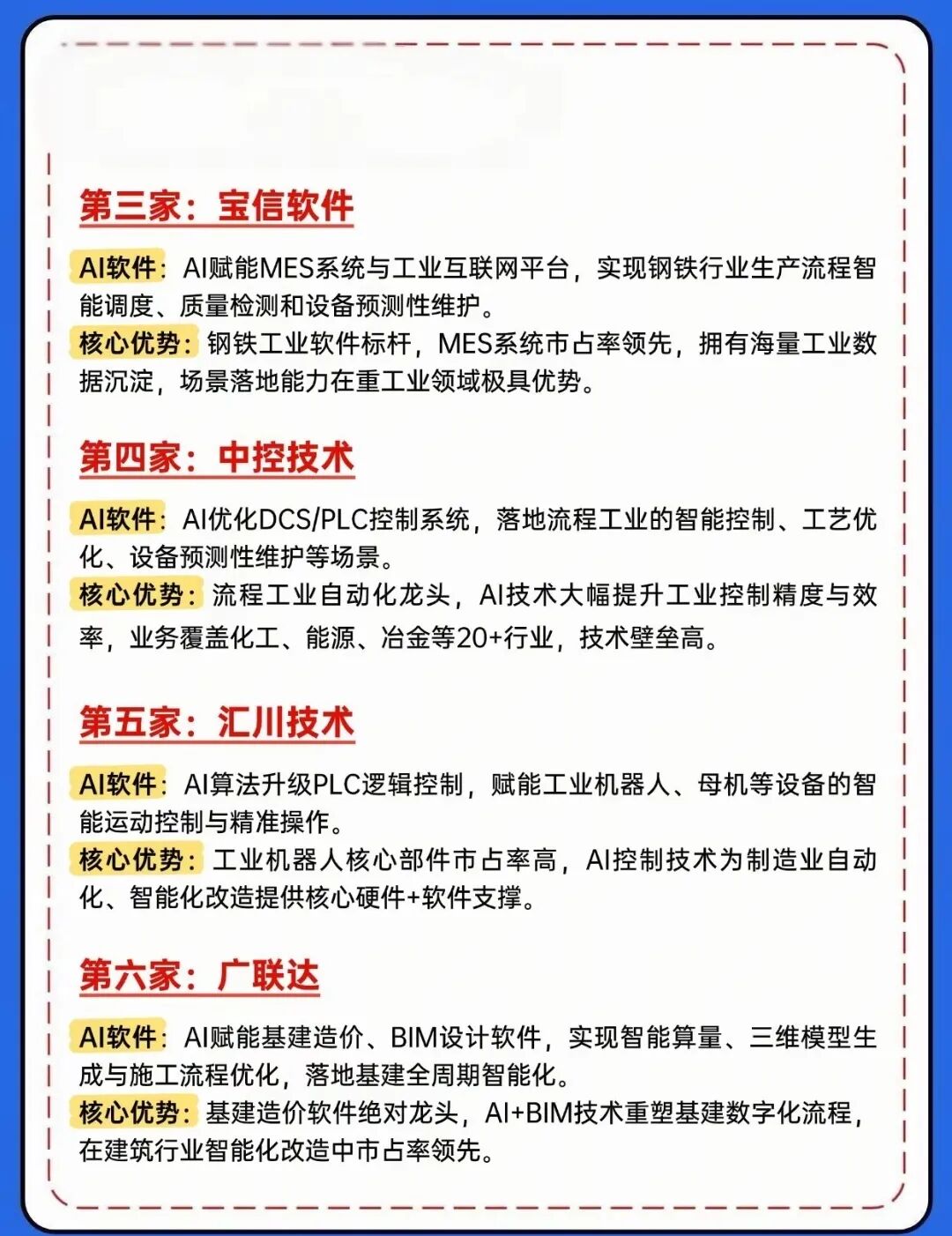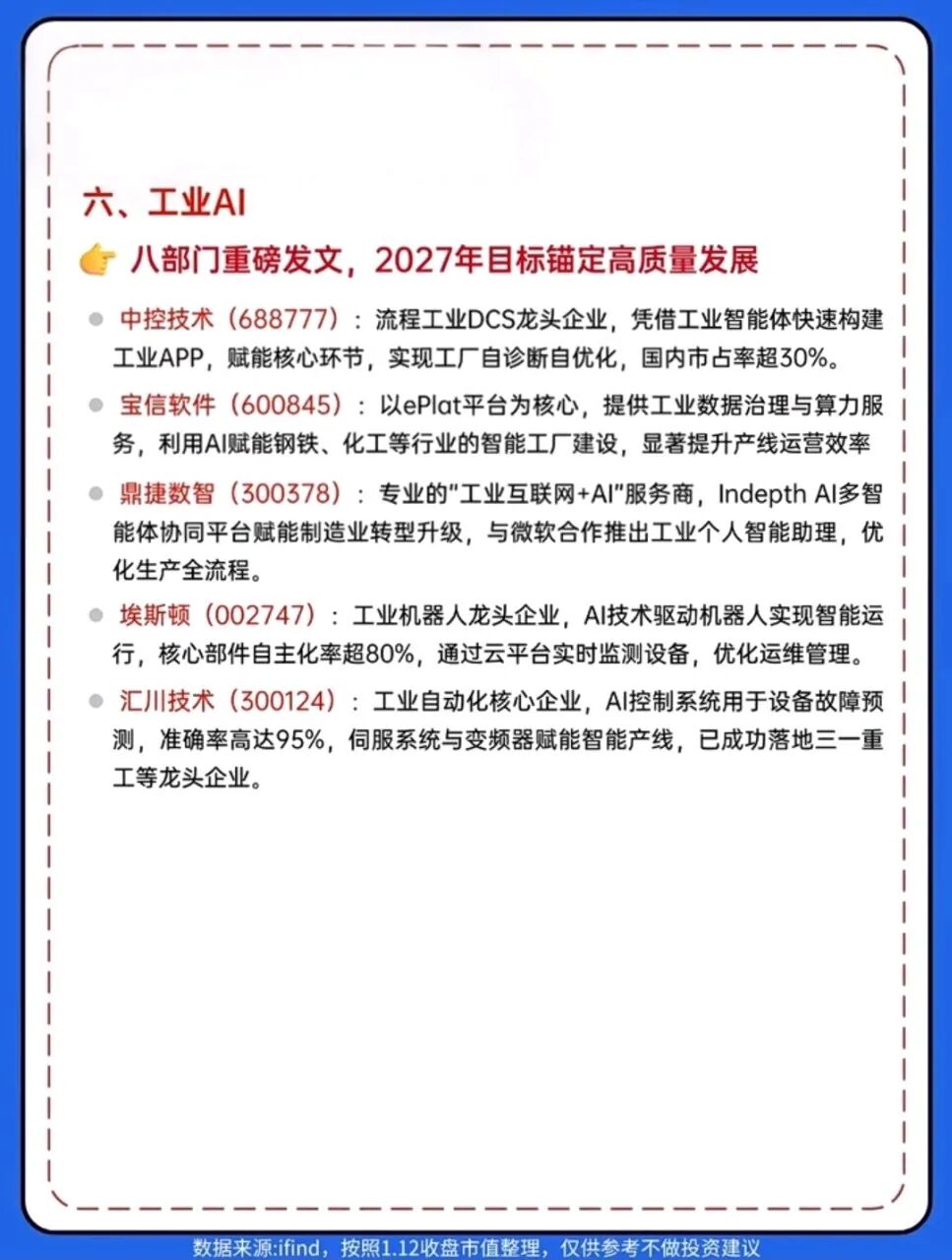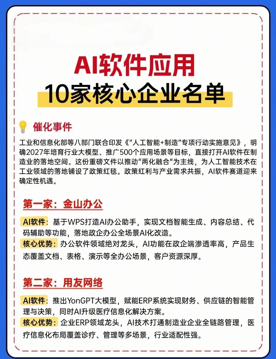 八部门“人工智能+制造”政策红利落地,工业、办公、金融、医疗等场景全面开花。行业龙头代表:金山办公、中控技术、用友网络、宝信软件等等。