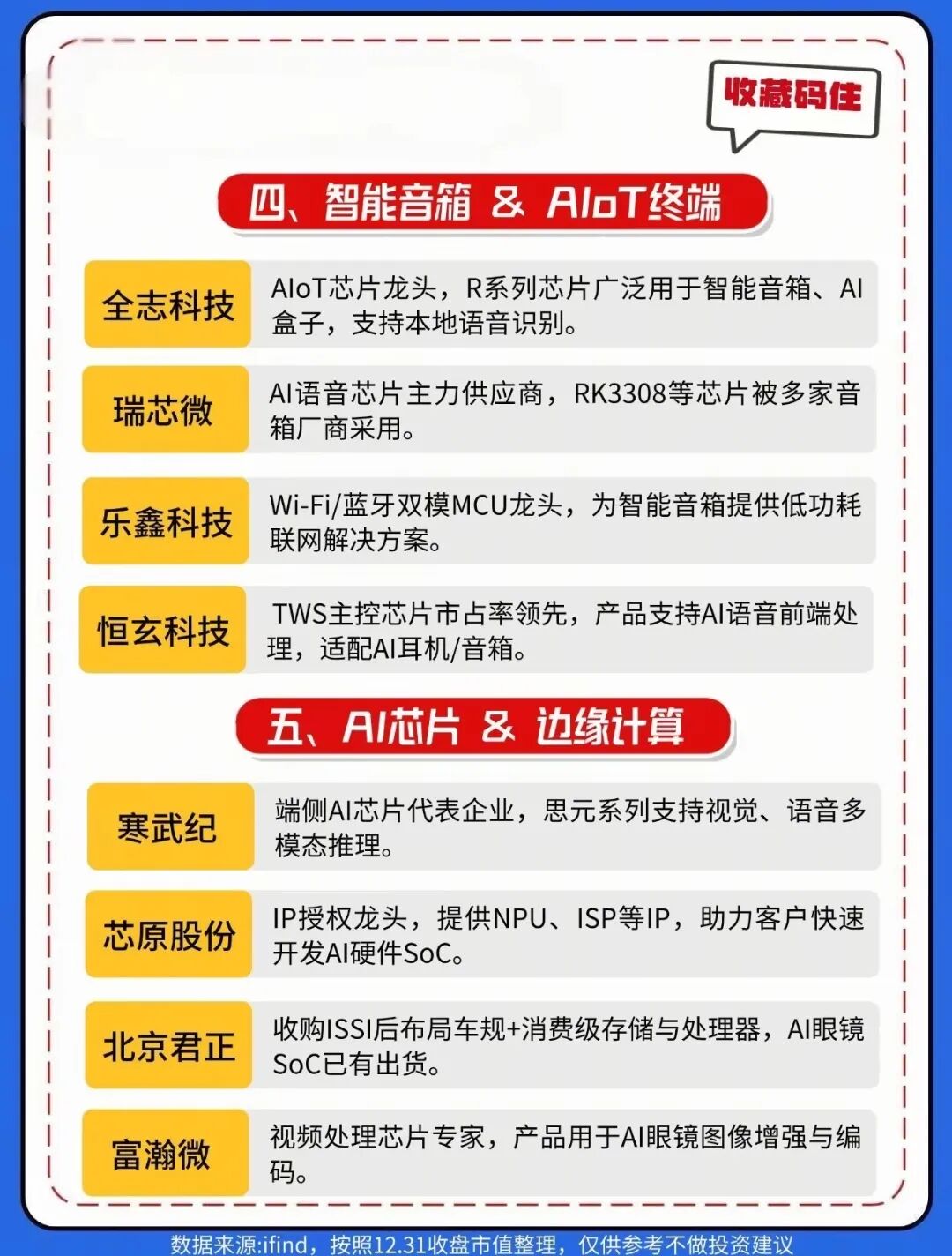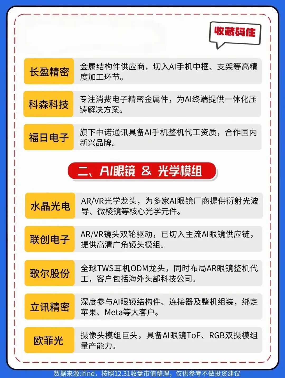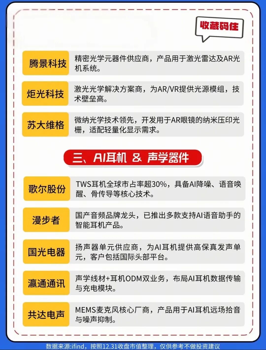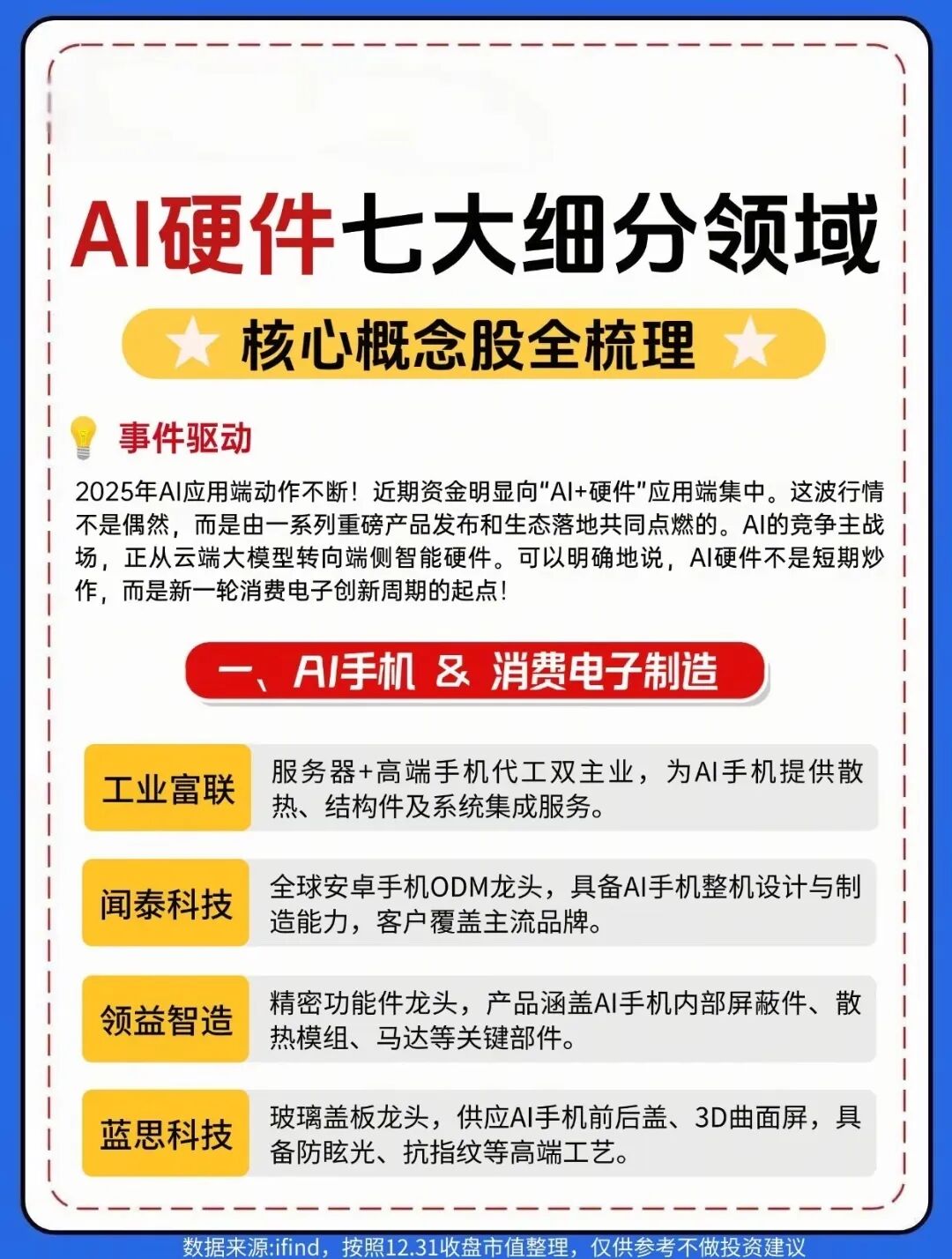 AI硬件七大细分领域核心标的全梳理!2026年AI硬件进入算力+端侧双轮驱动的业绩兑现期,投资核心抓“算力基建硬刚需+端侧AI商业化落地”,从AI手机、眼镜到耳机,从芯片到生态合作,消费电子创新周期已全面启动。