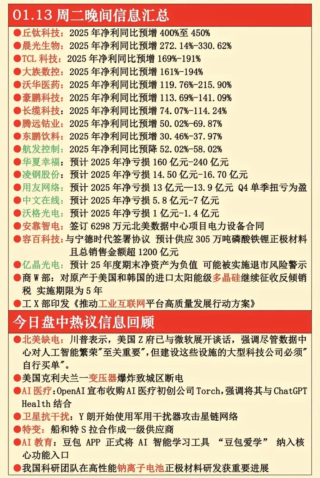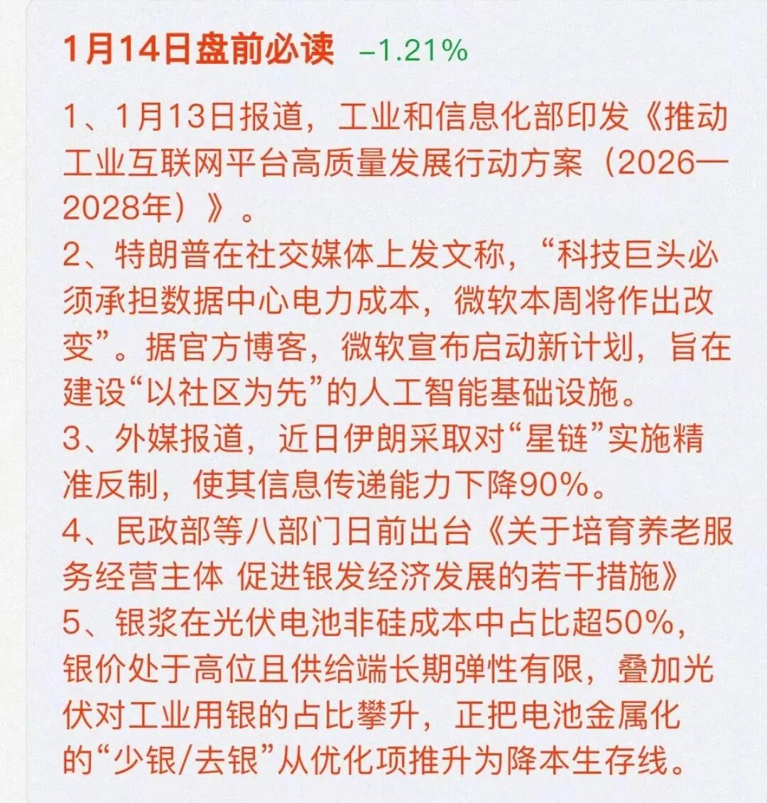 1月14日盘前必读!工信部发文力挺工业互联网,AI基建、工业互联迎政策红利;特施压科技巨头承担数据中心电力成本,微软启动新AI基建计划;伊反制星链、养老服务政策出台、光伏“去银”技术升级等事件接踵而至,相关概念值得关注。