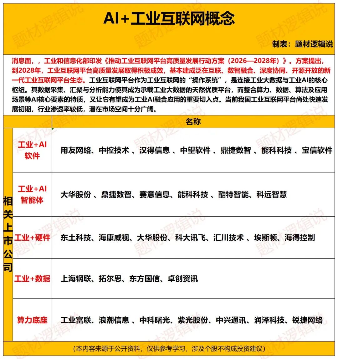消息面,工业和信息化部印发《推动工业互联网平台高质量发展行动方案(2026—2028年)》。