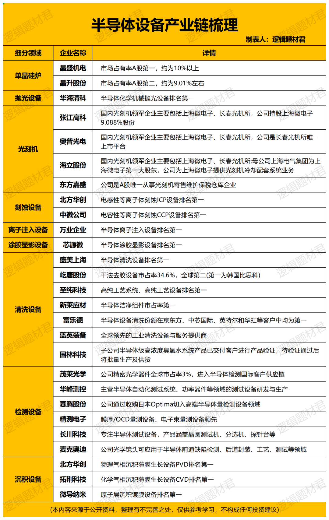 需要说明的是,本文聚焦同时具备技术壁垒与国产替代潜力的半导体设备企业,并根据产业链地位选出10家公司,仅供大家当下参考,欢迎大家交流补充!
