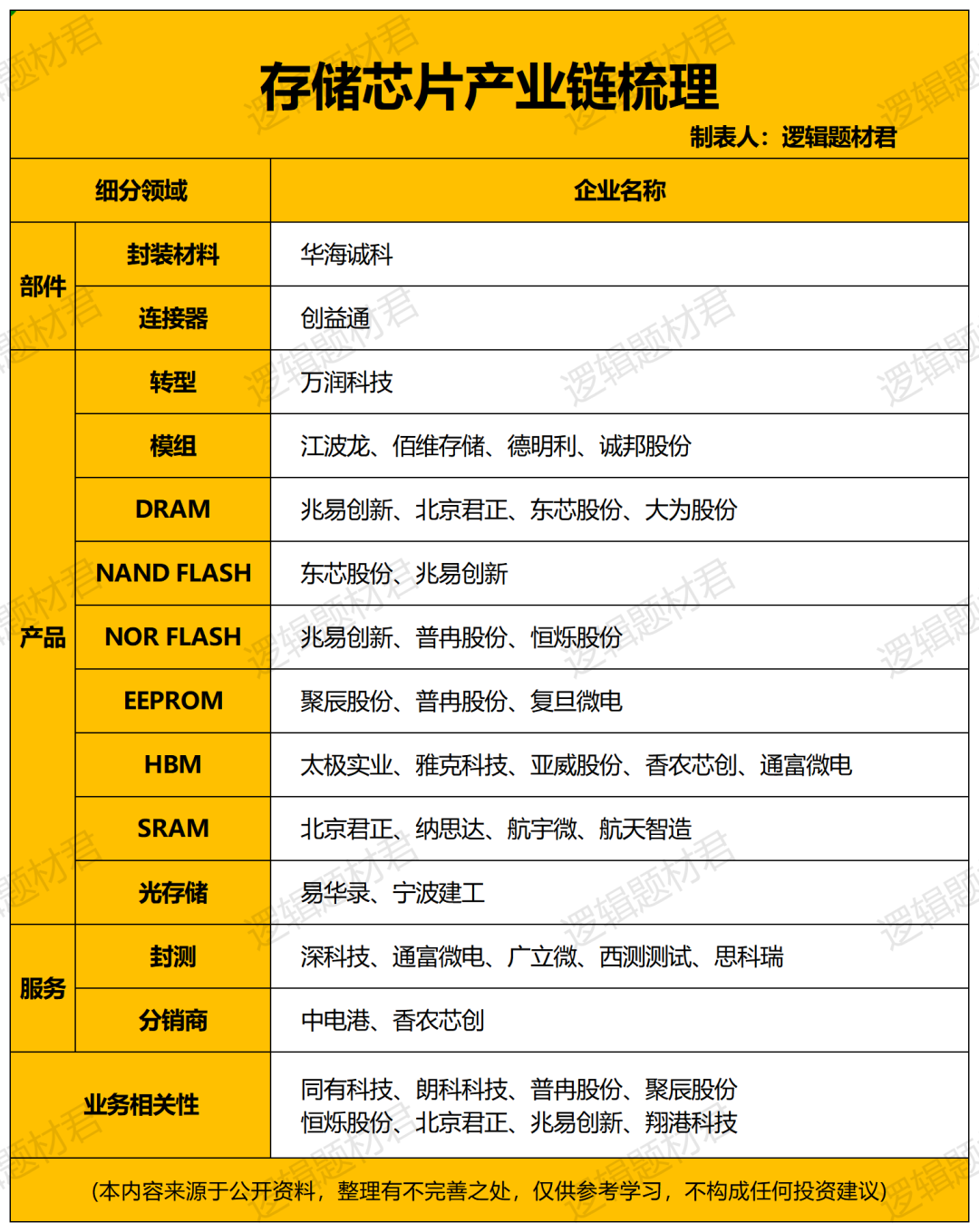 需要说明的是,本文聚焦同时具备技术壁垒与国产替代潜力的存储芯片企业,并根据产业链地位选出10家公司,仅供大家当下参考,欢迎大家交流补充!