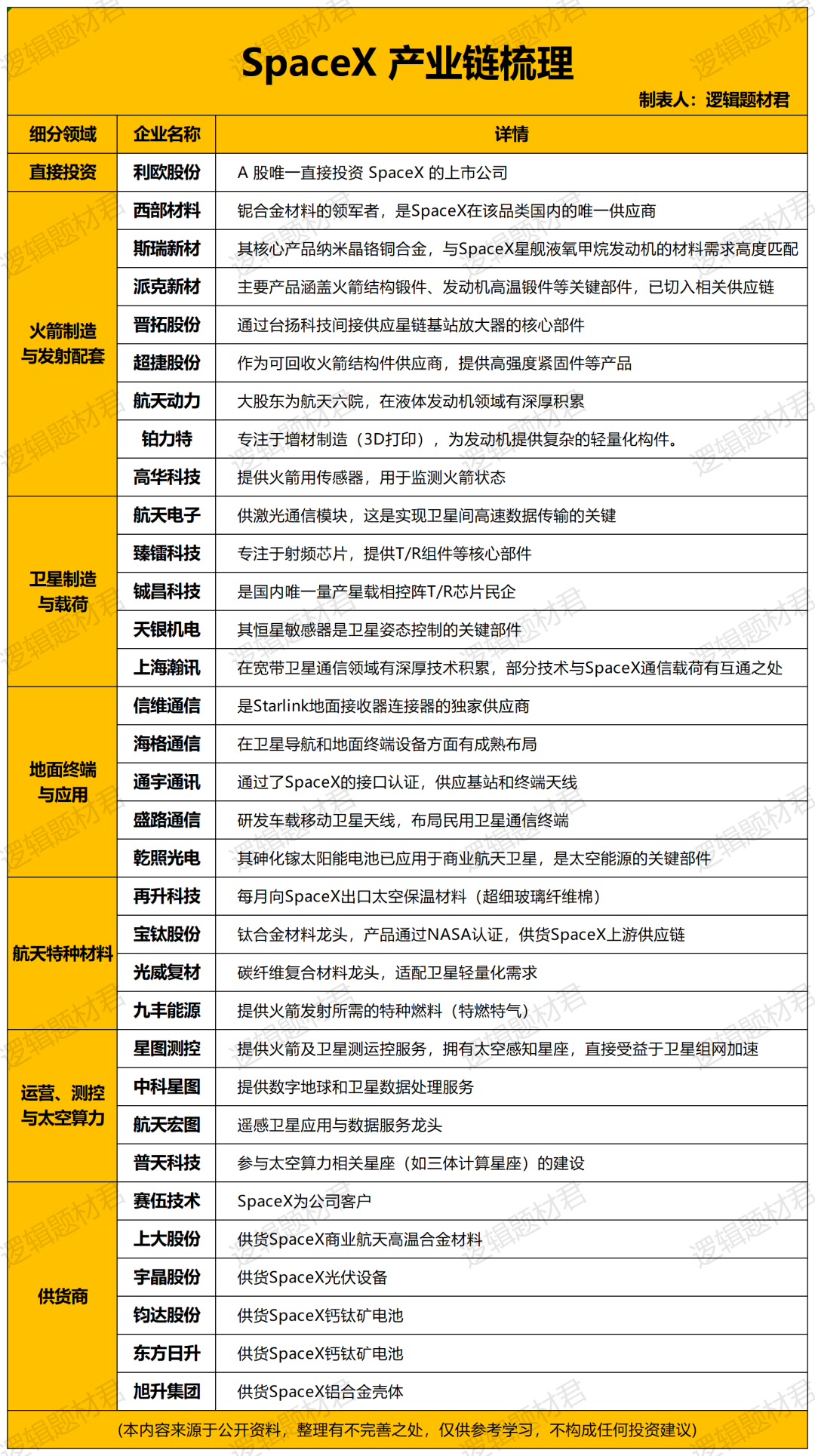 本期我们梳理了SpaceX全产业链,筛选出最新10家核心龙头企业,为把握产业机遇提供参考。