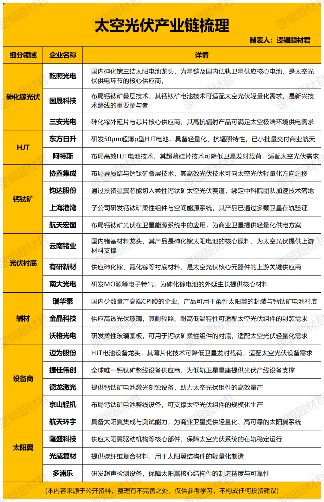 本期我们梳理了太空光伏全产业链,筛选出最新10家核心龙头企业,为把握产业机遇提供参考。