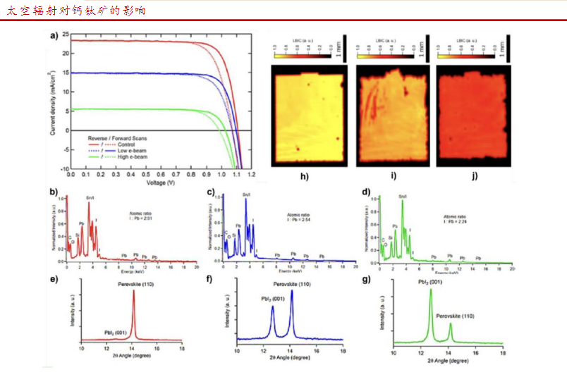 目前已经有论文提出了相关器件结构优化策略,同时指出具有优异抗辐射性能的CIGS 组件能够与钙钛矿组成叠层电池,能够兼具高辐射耐受性(85%效率保持率)与轻量化(4W/g),是当前最有潜力的太空应用方案。