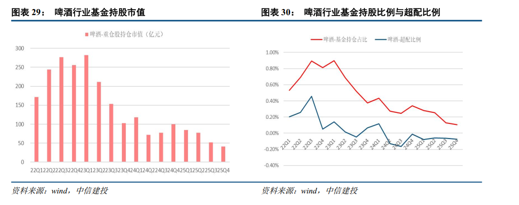 【啤酒】:重仓市值及比例环比下降,超配比例下降