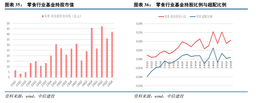 基金持仓方面,2025Q4休闲零食板块基金重仓持股比例环比提升0.02pcts至0.11%,重仓持股市值环比上升17.17%至42.09亿元;板块整体超配比例环比上升0.01pct至0.01%,超配比例略有提升。近期事件来看,鸣鸣很忙上市在即,板块关注度提升。