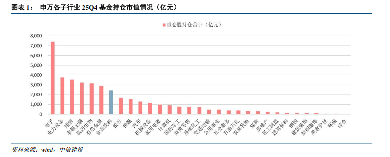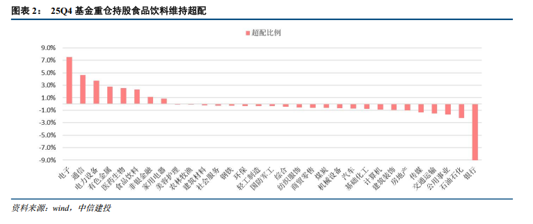 2025Q4食品饮料板块基金重仓持股总市值为2425.52亿元,环比下降6.02%,居申万一级行业第七位。板块超配比例位居各行业第六,环比有所下降。25Q4食品饮料在基金重仓持有股票的流通市值合计中占比6.1%,计算得超配2.33%,环比-0.03pcts。