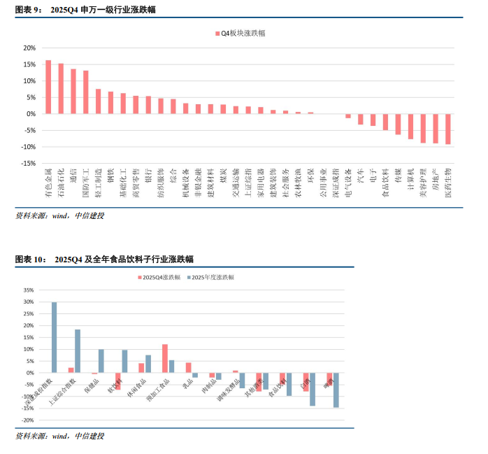 25Q4食品饮料板块基金重仓持股总市值为2425.52亿元,环比下降6.02%,位于申万一级行业的第七位;在基金重仓持有股票的流通市值合计中占比6.10%,计算得超配2.33%,环比-0.03pcts。板块涨跌幅来看,食品饮料板块四季度涨幅靠后,下跌4.88%,位列31个申万一级行业中第25位,弱于深证成指4.87%,弱于上证综指7.1%。