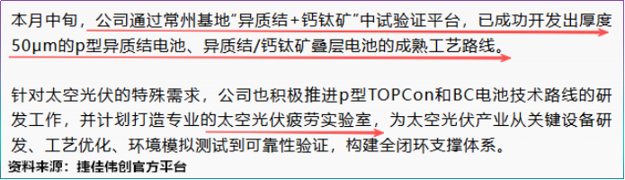 就在1月,捷佳伟创成功开发出厚度50μm的P型异质结电池、异质结/钙钛矿叠层电池工艺路线,借“异质结+钙钛矿”中试平台积极推动太空光伏设备研发。
