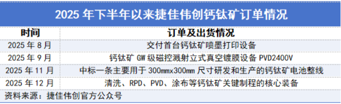 截至目前,捷佳伟创钙钛矿订单包括一条300mmx300mm尺寸的钙钛矿电池整线,出货两台钙钛矿真空镀膜设备、PVD设备及喷墨打印设备等多台钙钛矿设备。