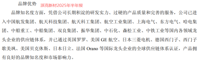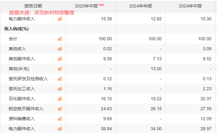 公司专注锻件业务,产品涵盖了多个领域,而从公司的营收结构看,2025年上半年,电力锻件业务收入占比提高到了38.84%,航空航天锻件业务占比为24.63%。
