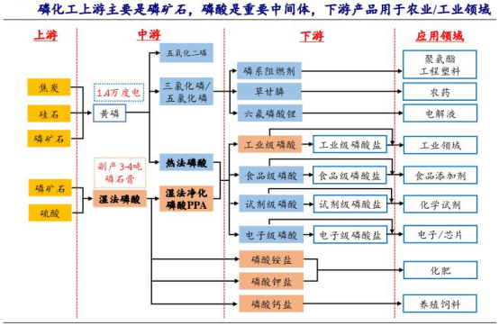 磷化工产业链上游原料主要是磷矿石和硫磺,按工艺的不同,磷矿石可以直接与无机酸(硫酸等)反应制成磷酸,接着加工成各种磷化工产品;也可以先制得黄磷,再制成磷酸。下游磷化工产品主要分为两大类:一类是应用于农业中,如以磷酸一铵、磷酸二铵及磷酸氢钙为代表的磷肥,或草甘膦等含磷农药;另一类则是广泛用于工业、食品、医药领域的磷酸盐,包括三聚磷酸钠、六偏磷酸钠等。