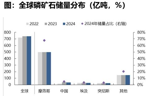 2024年全球磷矿基础储量为740亿吨,分布不均匀,主要集中在摩洛哥、中国、埃及、突尼斯等国家,中国磷矿储量达到37亿吨,占比为5%,为全球第二大磷矿石储量国,与第一名差距较大。