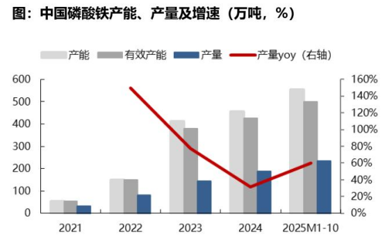 我国磷酸铁产能长期过剩,2025年起下游动储需求旺盛,带动磷酸铁产量及开工率提升。自2022年起,我国磷酸铁产能快速释放,2022年我国磷酸铁有效产能149万吨/年,而2025年磷酸铁有效产能提升至499万吨/年。我国磷酸铁行业经过了2023-2024年的调整,在下游动力电池、储能行业快速发展的情况下,磷酸铁供给端压力略有缓解,行业开工率也从2023年的38%,回升至2025年10月的73%。