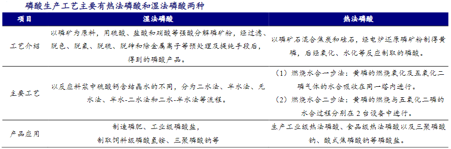 磷酸是磷酸盐产品生产的中间产品,按纯度分为农用级、饲料级、工业级、食品级等,纯度逐级递增,产品加工难度和附加值也逐级提高,磷酸制造技术是磷化工行业的核心技术,也是决定企业生产成本的关键技术。磷酸制备工艺路线主要为湿法磷酸和热法磷酸两种: