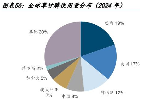 2024年全球草甘膦合计折百使用总量为87万吨,其中使用超过10万吨的有阿根廷、美国和巴西,三地合计使用占比达到48%。