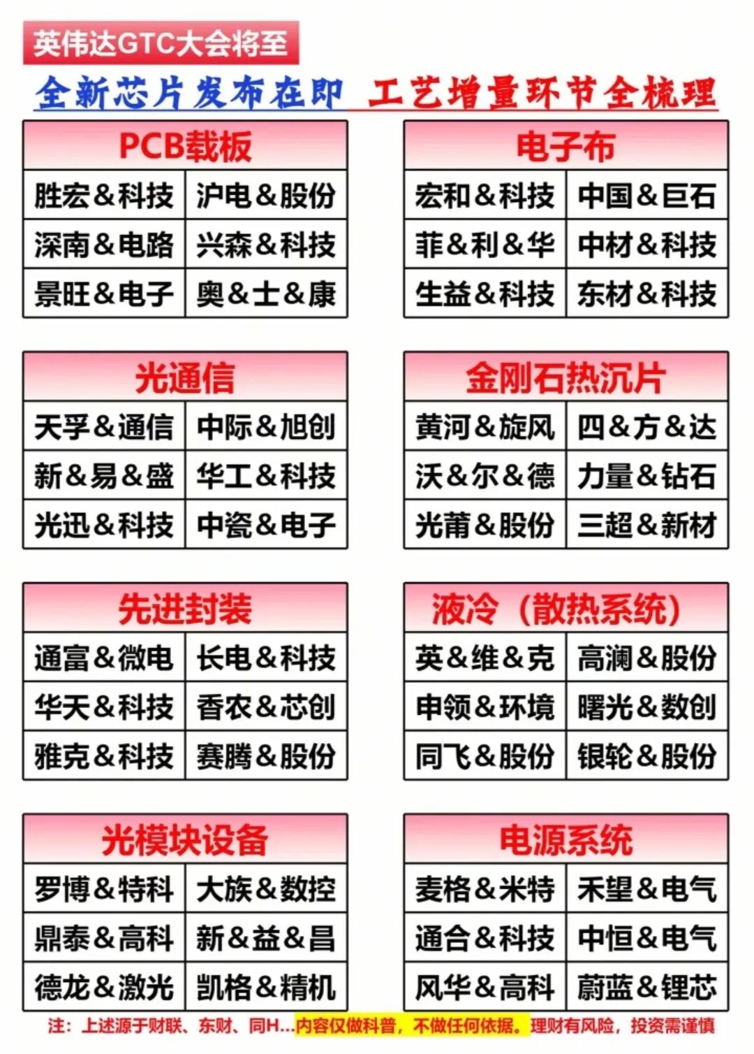 (3)英伟达GTC大会将至,全新芯片发布在即!英伟达GTC大会将于23月16日在美国加州圣何塞召开。黄仁勋预告将推出“世界前所未见”的全新芯片,旨在突破延迟和内存带宽瓶颈,重构AI底层算力。GTC大会是全球AI算力的风向标,利好电子布、光通信、液冷、光模块等等概念。