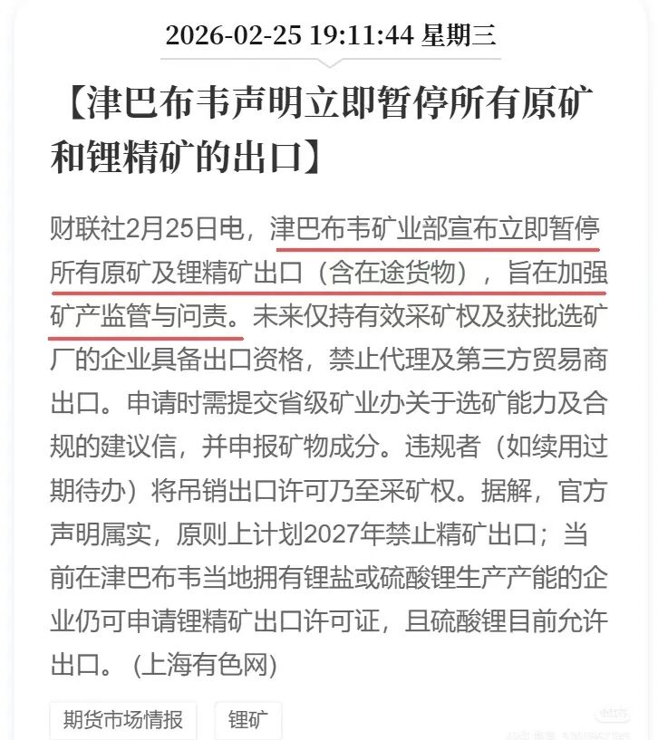 美将磷列为关键矿产,中国同步战略管控,供给收缩+定价重估。化工涨价潮来袭!磷化工、玻纤、有机硅等十大赛道龙头清单全出炉。2月25日,津巴布韦矿业部宣布立即暂停所有原矿及锂精矿出口,以加强矿产监管与问责……