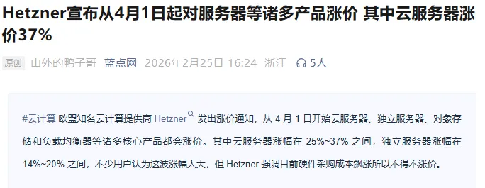 另外,欧洲云服务厂商Hetzner对旗下多项云服务产品涨价,云服务涨价25-37%,存储涨价30%;Hetzner云服务德国第一、欧洲第三左右的水平,全球10-15。