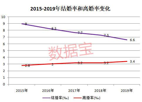 当代年轻人的婚姻观也在发生变化,晚婚、恐婚现象悄然形成。据民政部发布的数据显示,2019年,全年依法办理结婚登记 927.3万对,比上年下降 8.5%;依法办理离婚手续470.1万对,比上年增长5.4%。结婚率2019年降至6.6‰,离婚率则上升至3.4‰。