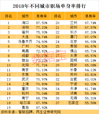 民生证券早前发布的研报显示,去年智联招聘联合珍爱网发布《2018 年职场人婚恋观调研报告》,参与调研的职场人里面,68.33%处于单身状态。在全国主要城市中,海口的单身率最高,87.5%职场人是单身。四大一线城市中,深圳职场单身率最高,达到77.23%,广州、上海、北京依次排在其后。